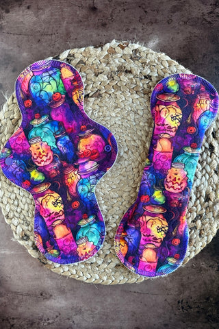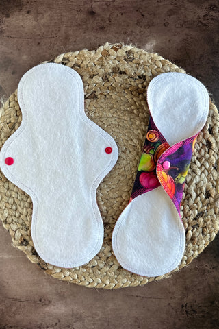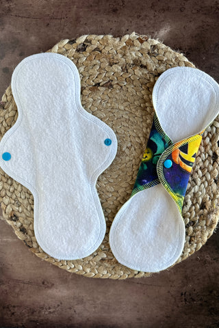 All pads are backed with a waterproof lined organic cotton fleece backer. Liner/Light pads are backed with an absorbent & waterproof layer in one.