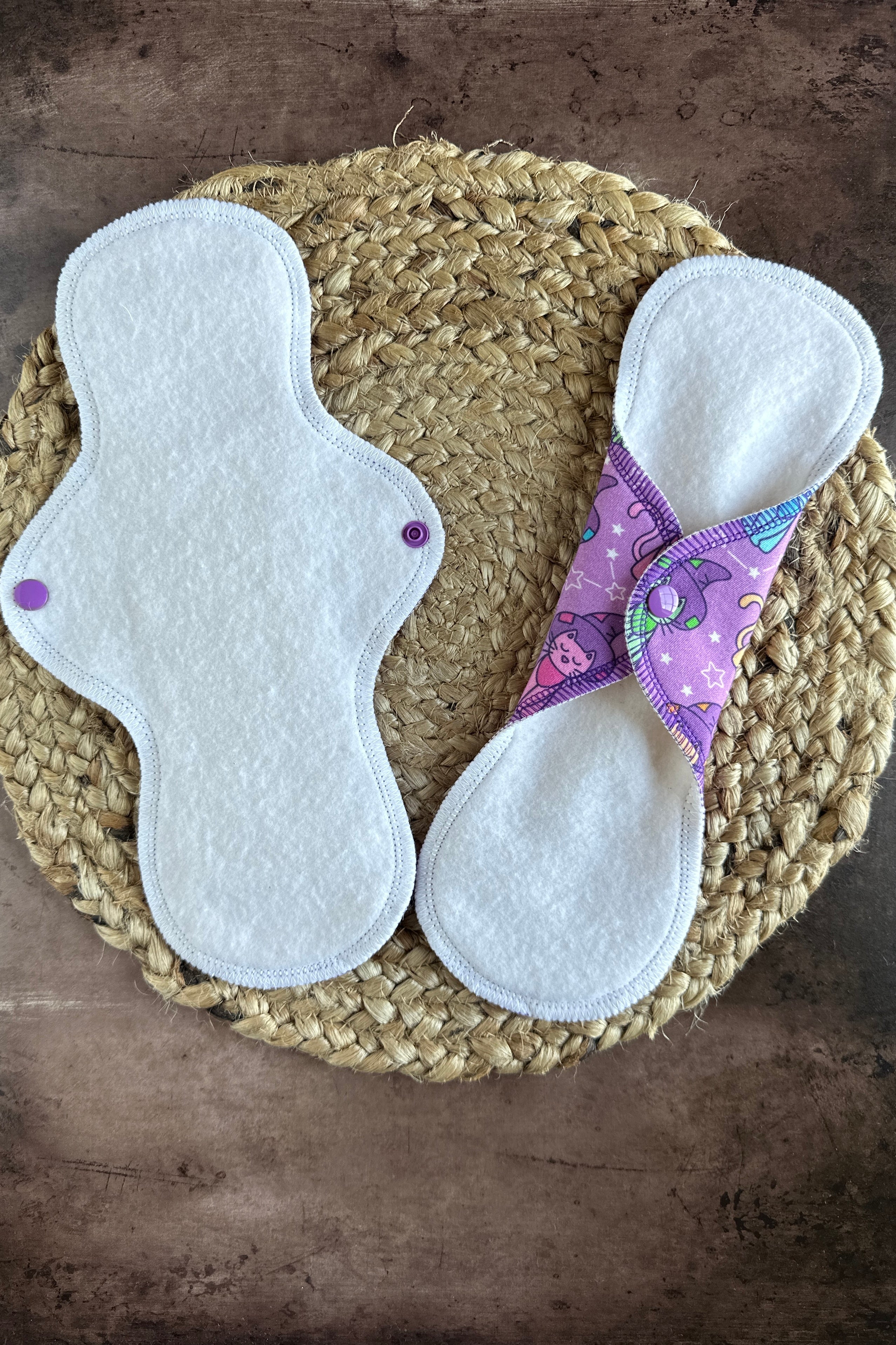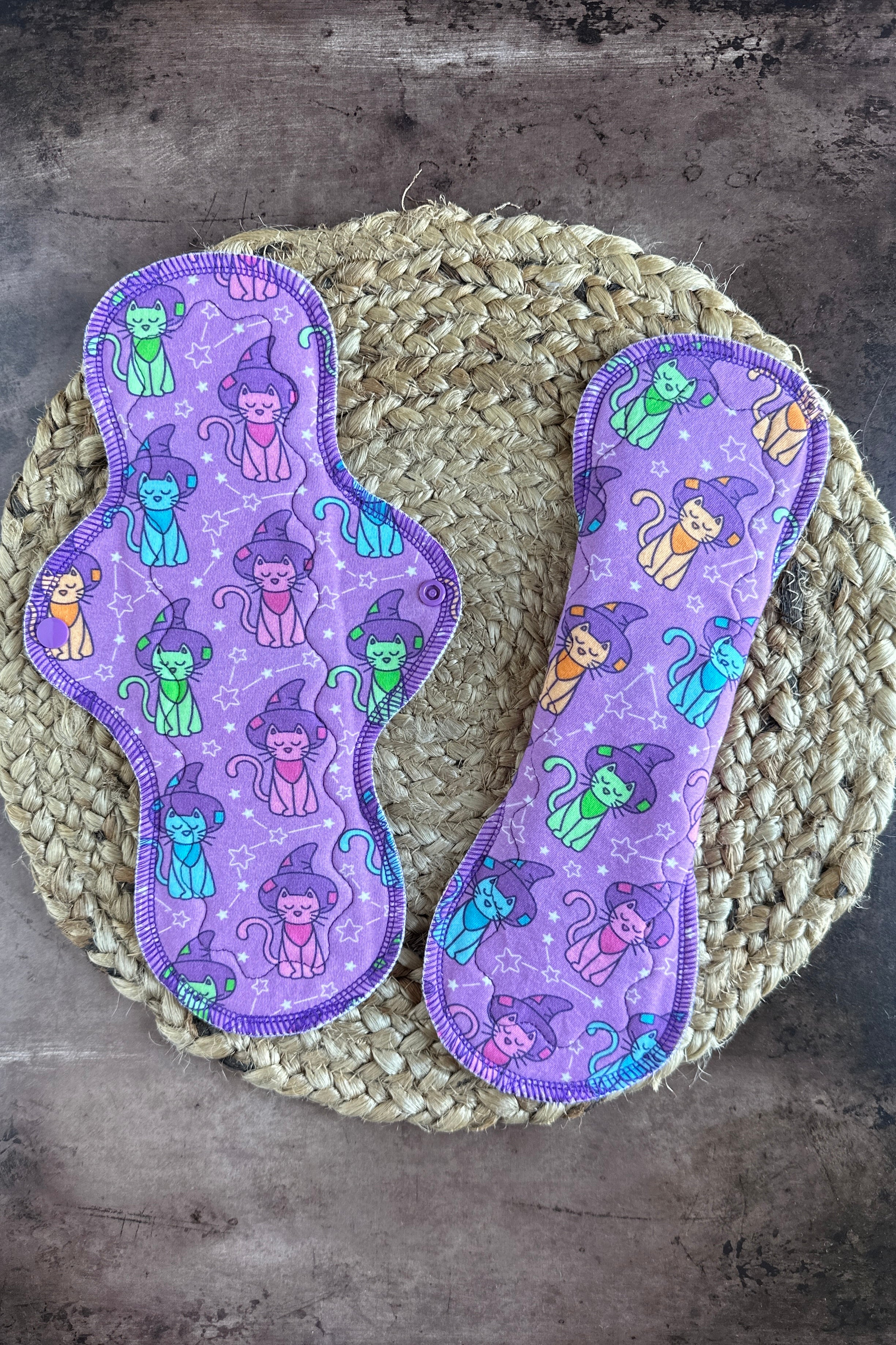 Our “Neon Cats” are reusable and washable cloth menstrual pads made of 100% organic cotton knit for all-day comfort and absorbency. They feature protective waterproof organic cotton fleece backers, serged edges for durability, an extremely absorbent lightweight core that provides maximum coverage, and directional flow lines for optimal use. Perfect for those seeking a sustainable and eco-friendly solution for periods.