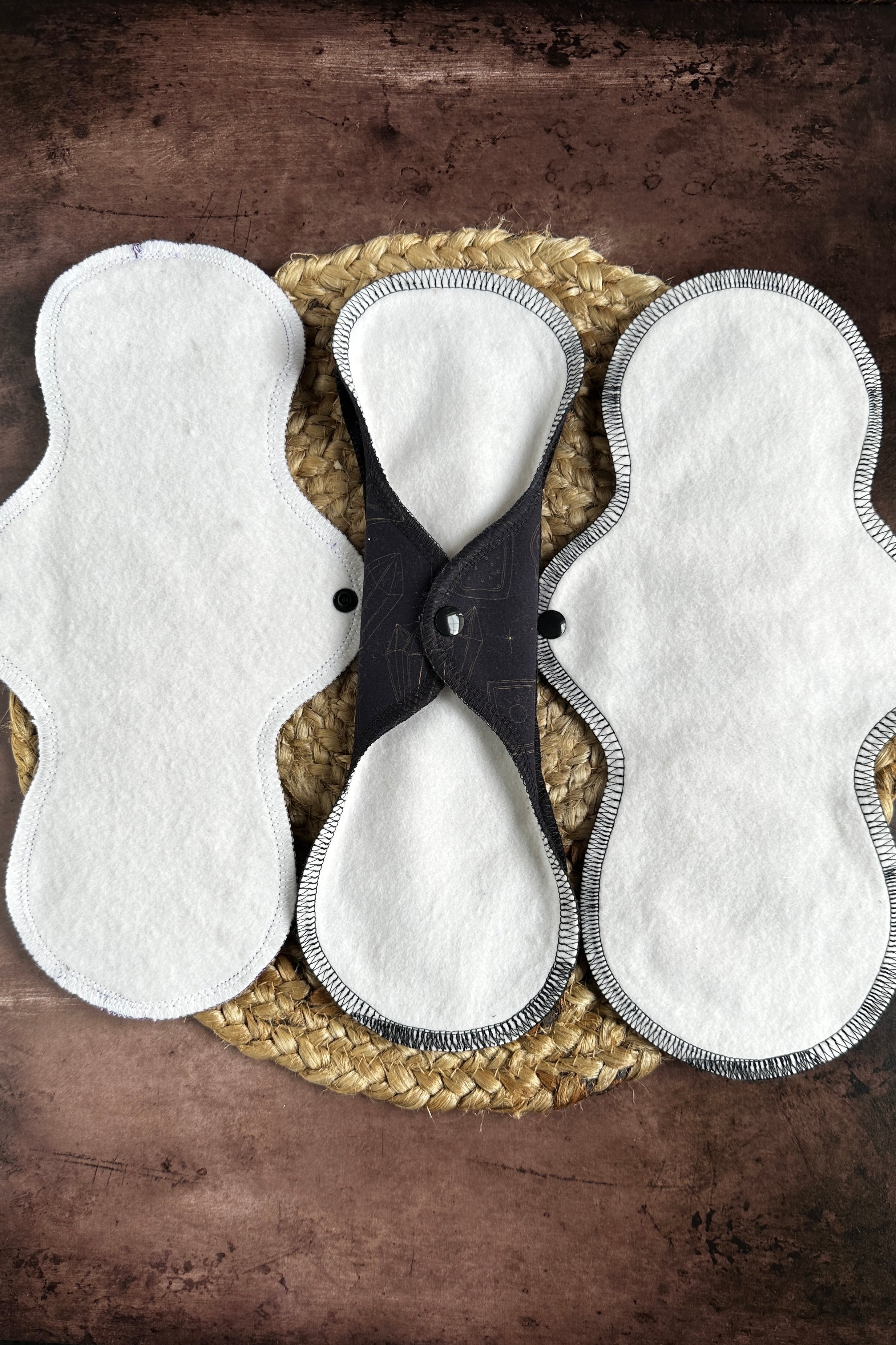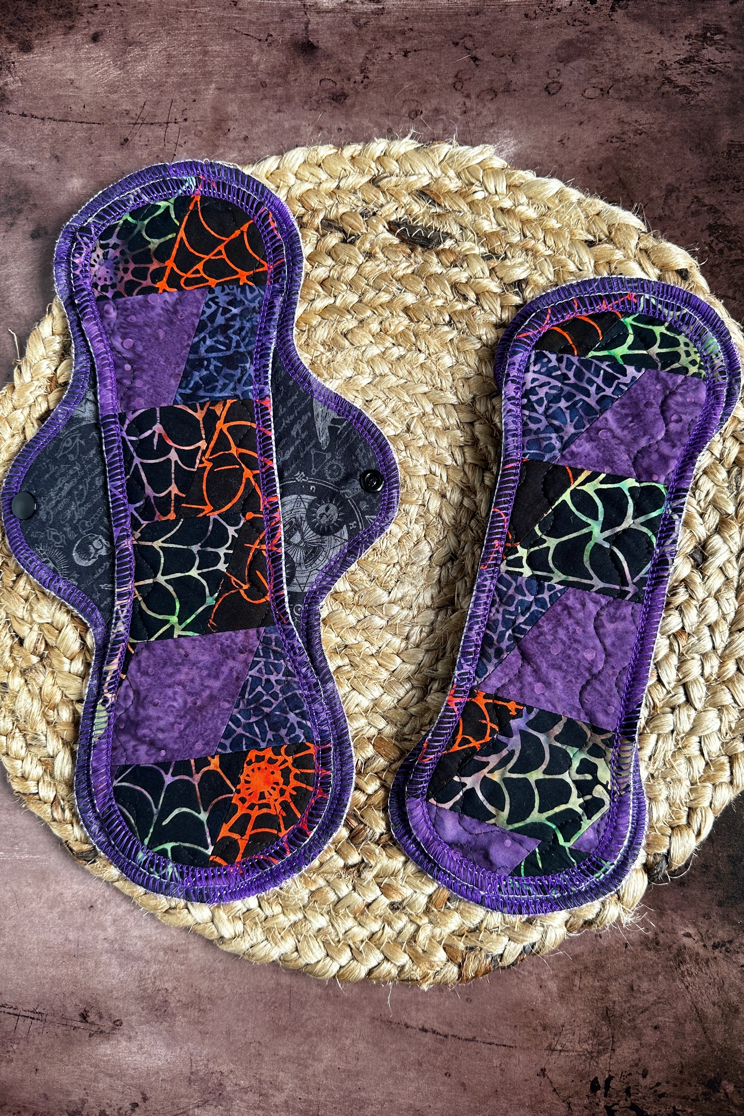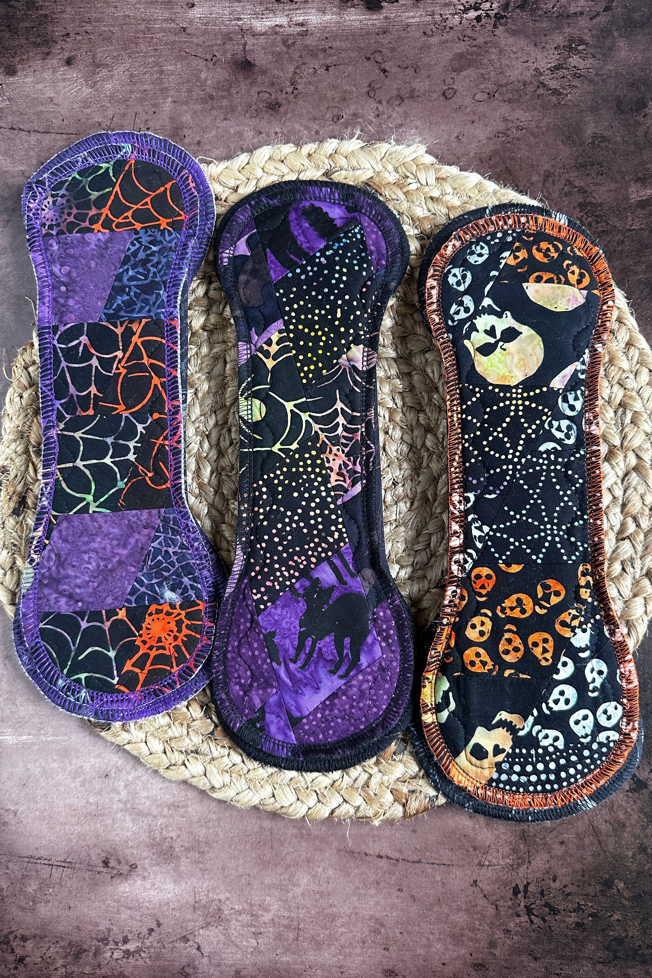 Our Quilted Cotton Batik Exposed Core pads are designed to improve your experience with menstrual products. The exposed core ensures maximum comfort and protection by raising the core to your body helping catch flows faster and prevent wing leaks. The beautiful, quilted, cotton batik fabric comes in a spooky, Halloween-themed print, and is available in 10", 12", and 14" lengths.